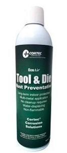EcoAir® Tool & Die Rust Preventative is an easy-to-use vegetableoil/solvent-based aerosol specifically designed for the protection of tools, molds, and dies. It can also be used as general corrosion protection on most metal surfaces including sheet metal, wire, pipes, flanges, and other fabricated and/or machined parts. EcoAir® Tool & Die Rust Preventative protects by forming a tenacious film on metal surfaces. It repels water and protects against other corrosive elements such as chlorides, hydrogen sulfide, and other sulfur compounds. EcoAir® Tool & Die Rust Preventative also provides excellent lubrication. EcoAir® Tool & Die Rust Preventative is packaged in air-powered bag-on-valve spray cans.