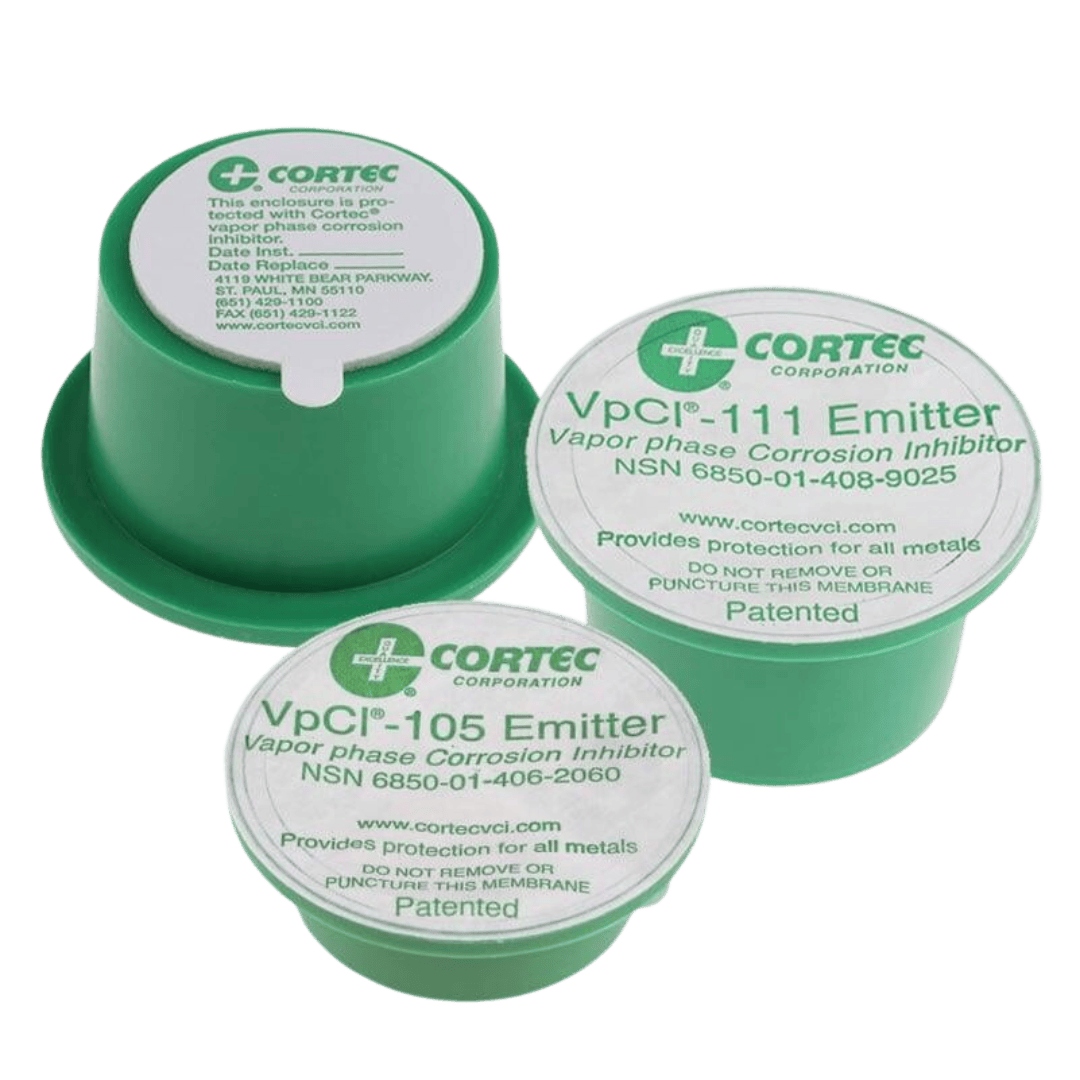 Emitters represents a breakthrough solution in corrosion prevention. VpCI® compounds diffuse into the air and bond to any metal surface. The coverage is complete – all surfaces, crevices, cavities, and other inaccessible void areas receive total protection. The VpCI® barrier is self-replenishing, even for packaging that’s repeatedly opened, and typically protects for up to 24 months. As pictured, the emitters typically come in either puck-shaped containers or as 0.25" thick foam pieces.